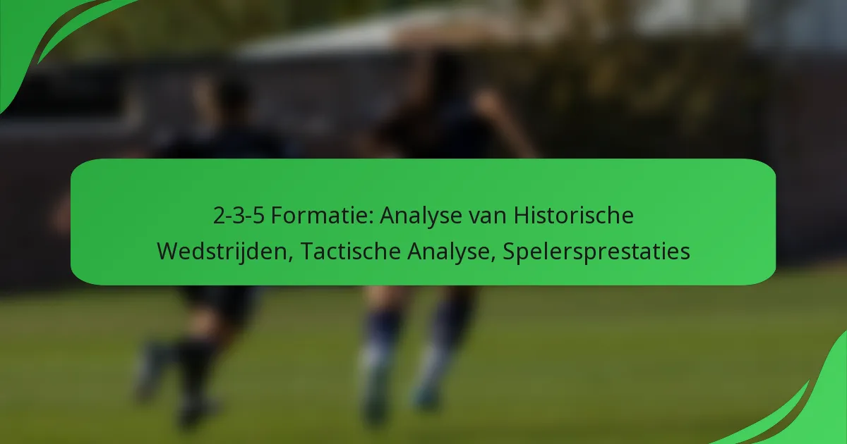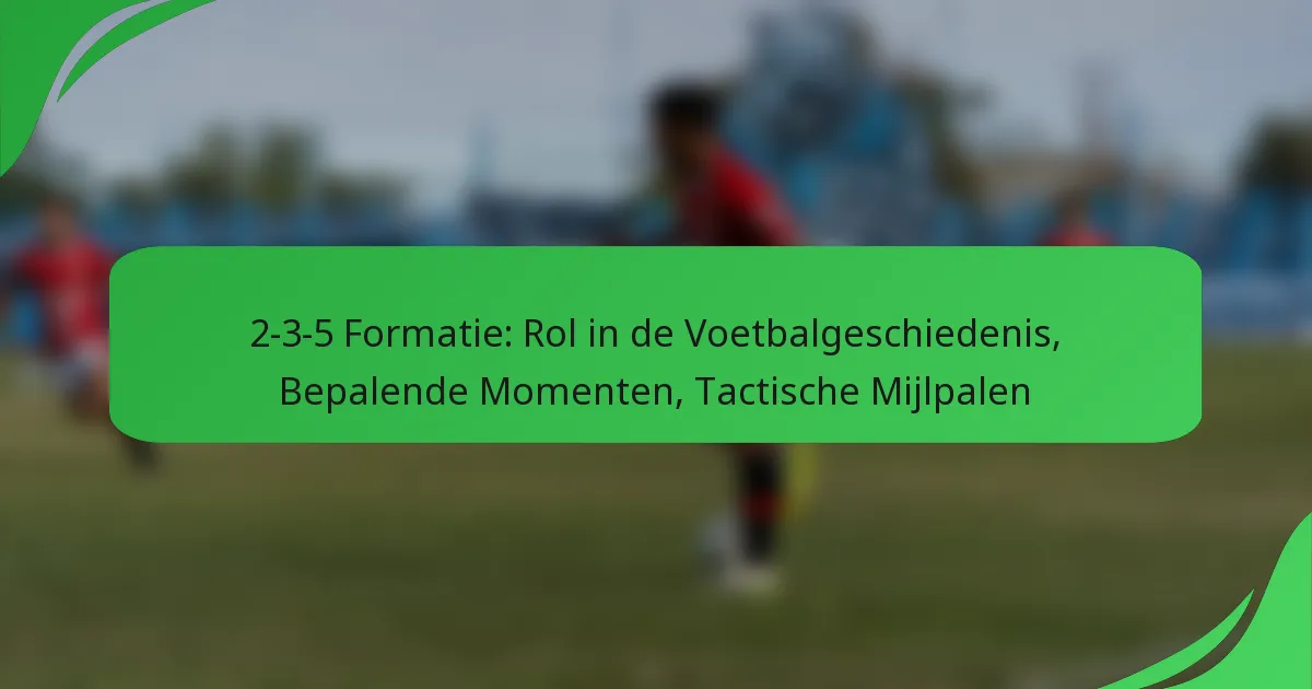 De 2-3-5 formatie is een klassieke opstelling in het voetbal die bestaat uit twee verdedigers, drie middenvelders en vijf aanvallers, waarbij de nadruk ligt op offensief spel om scoringskansen te maximaliseren. Deze formatie ontstond eind 19de eeuw en werd gevormd door belangrijke figuren in de voetbalgeschiedenis die de tactische benadering verfijnden, waarbij zowel offensieve als defensieve strategieën in balans werden gebracht naarmate het spel evolueerde van zijn eerdere chaotische stijlen.